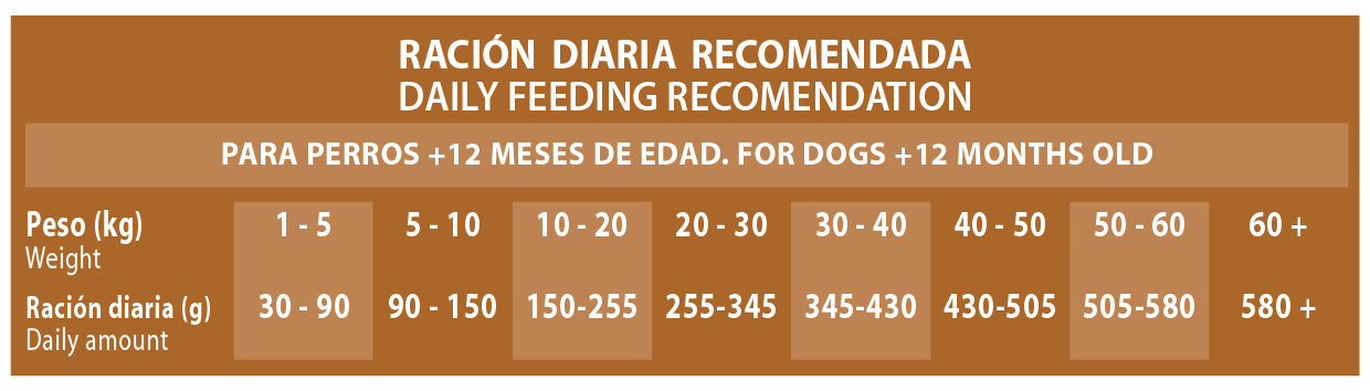 | Composición: Carne de cerdo ibérico deshidratada* (14%), Trigo*, Maíz, Salvado de trigo*, Arroz* (12%), Carne deshidratada* (12%), Cebada*, Grasa animal*, Algarroba*, Pulpa de remolacha*, Pollo hidrolizado*, Levadura de cerveza*, Aceite de salmón*, Minerales, Algas marinas* (0,5%), Prebiótico MOS*, Yuca de mojave*. |